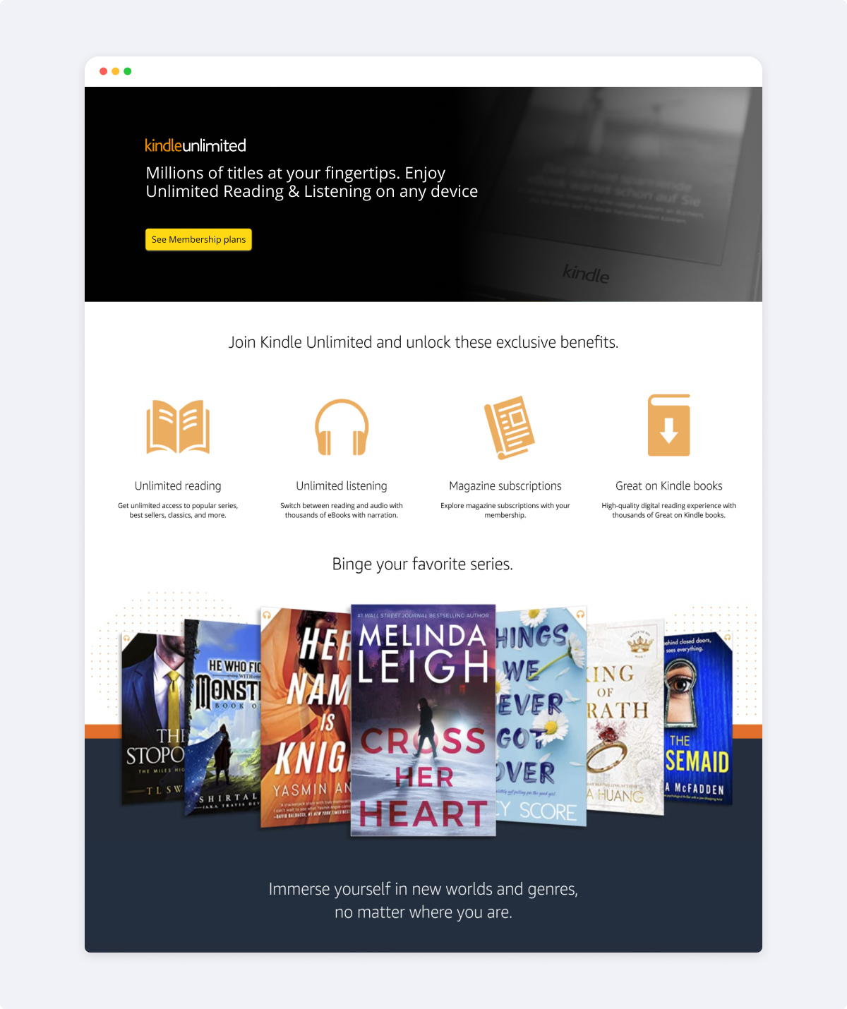 Driving growth for the Kindle product and Kindle Unlimited service. I collaborated with the Product Strategy Director of Amazon's Books team, to developed a user-centered experience that attracts and retains Kindle subscribers.