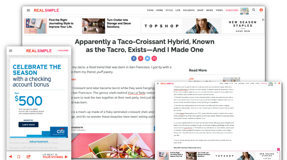 Meredith wanted to expand monetization opportunities across their digital properties through advertising and user subscriptions. Backed by data and strategy, I created a suite of behaviorally activated advertising and marketing solutions that prioritize reading experience over ad volume. The impactful, non-intrusive ads delivered unparalleled performance and subscription increase. This project was attributed to $5M in additional net revenue.